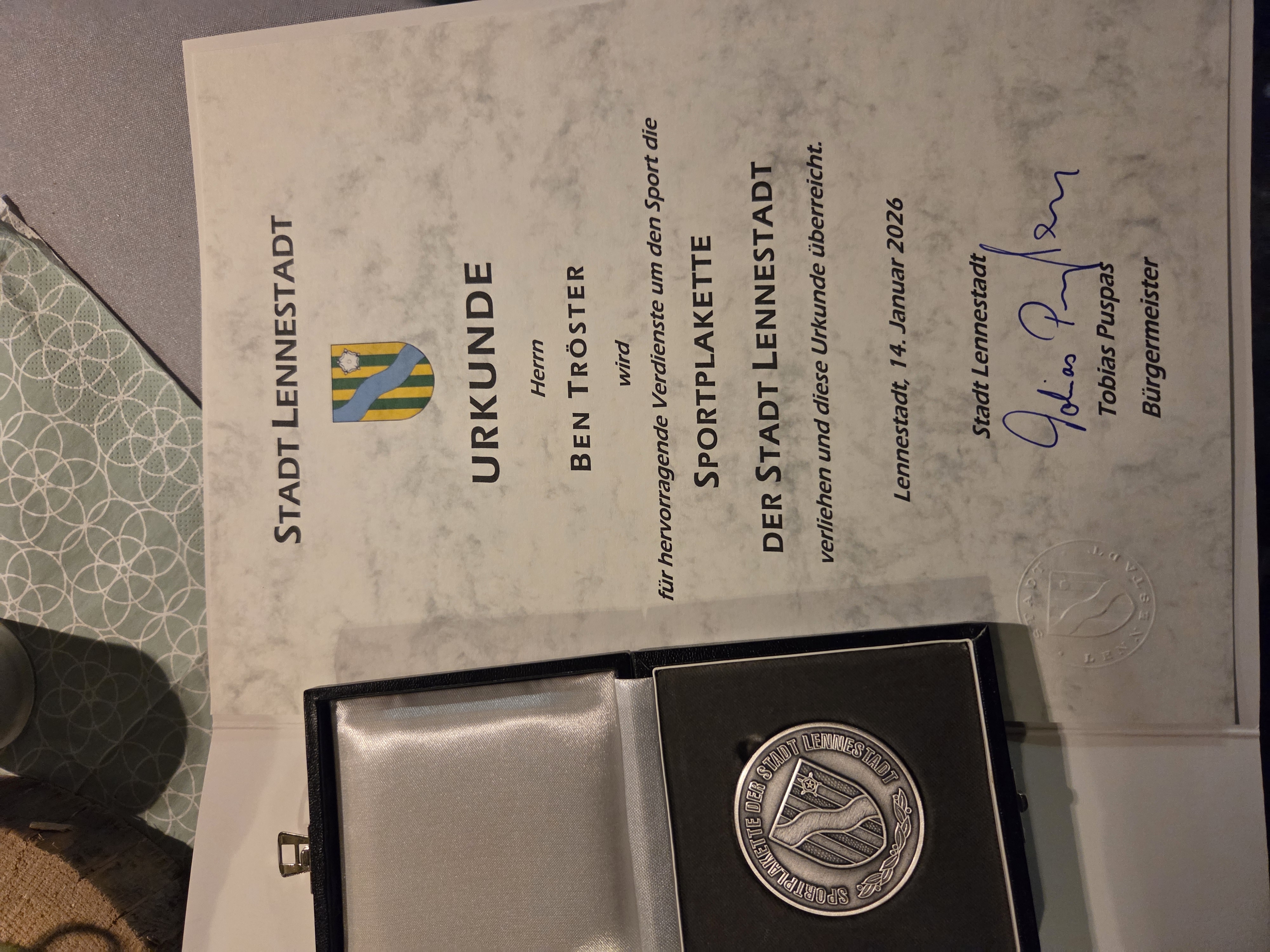 Während der Thomas-Morus-Sitzung am 14. Januar 2026 erhielt er die Stadtsportplakette. Überreichet wurde ihm diese von Bürgermeister Tobias Puspas, Lothar Schenk (Vorsitzender Stadtsportverband) und Dirk Büdenbender (1. Vorsitzender TSG Lennestadt) im vollbesetzten Ratssaal 1 des Rathauses. Die Laudatio für Ben wurde von der Gastrednerin Verena Bentele, ehemalige Para-Biathletin und Paralympics-Siegerin und derzeit Präsidentin des VDK gehalten.